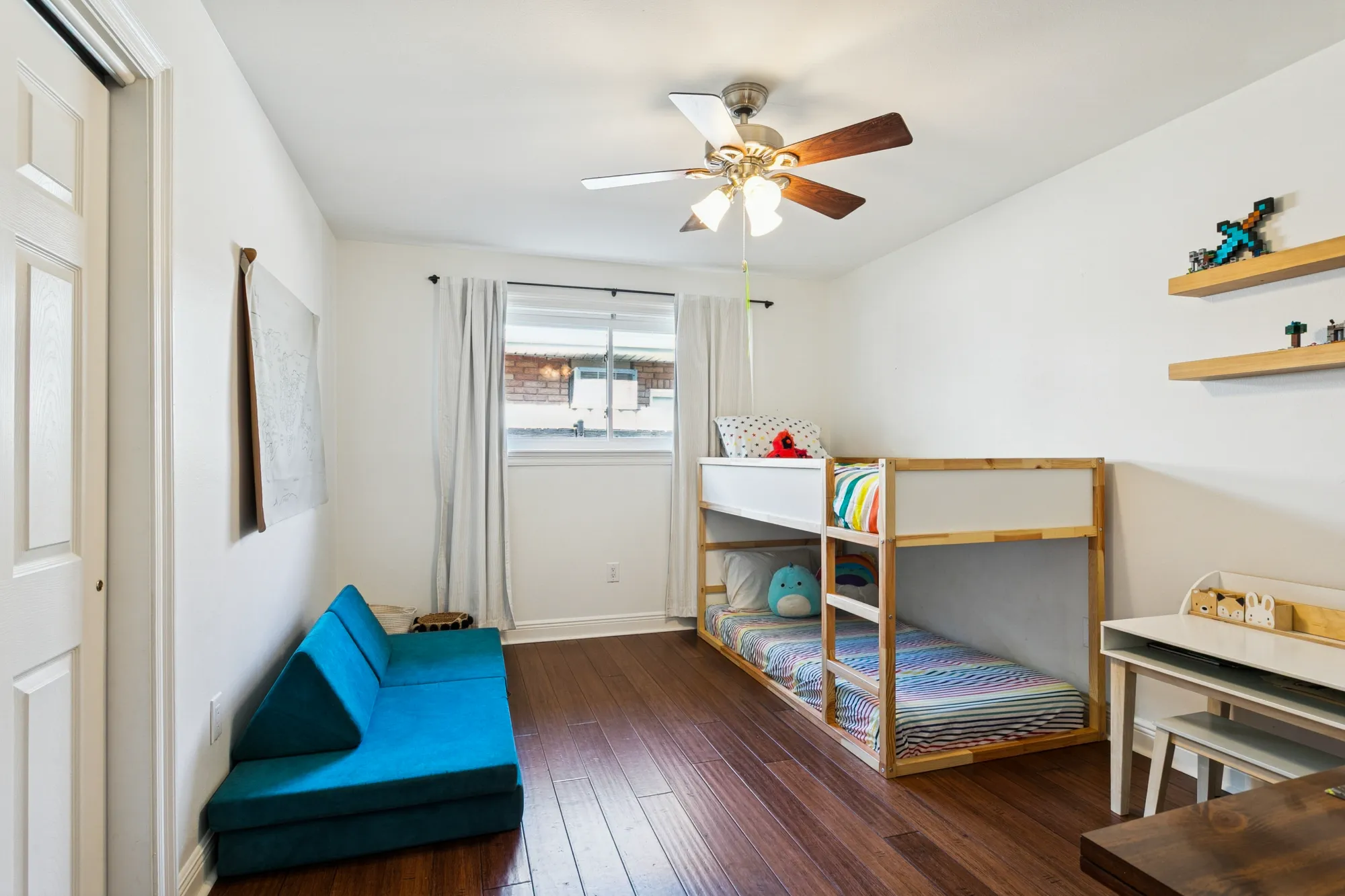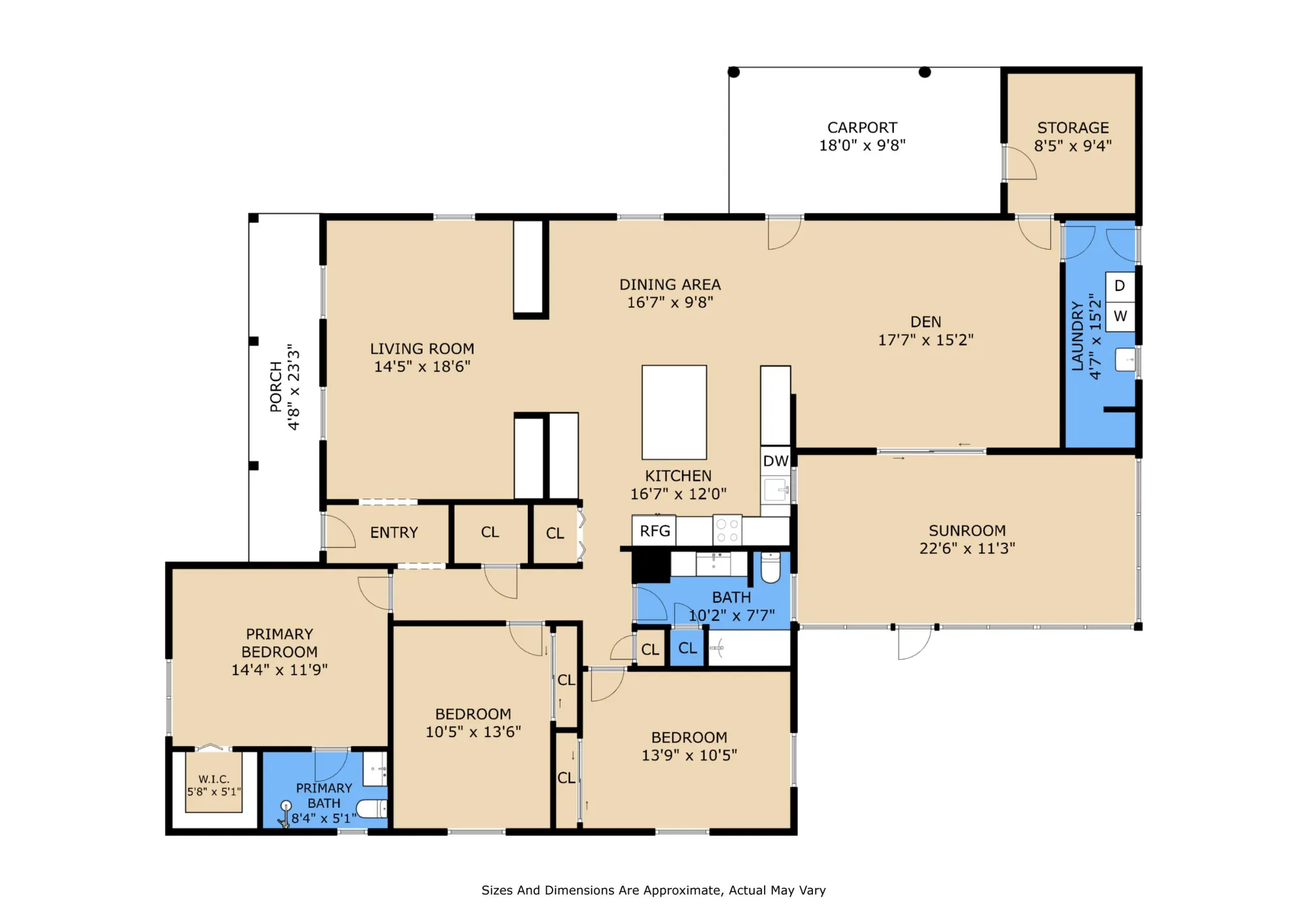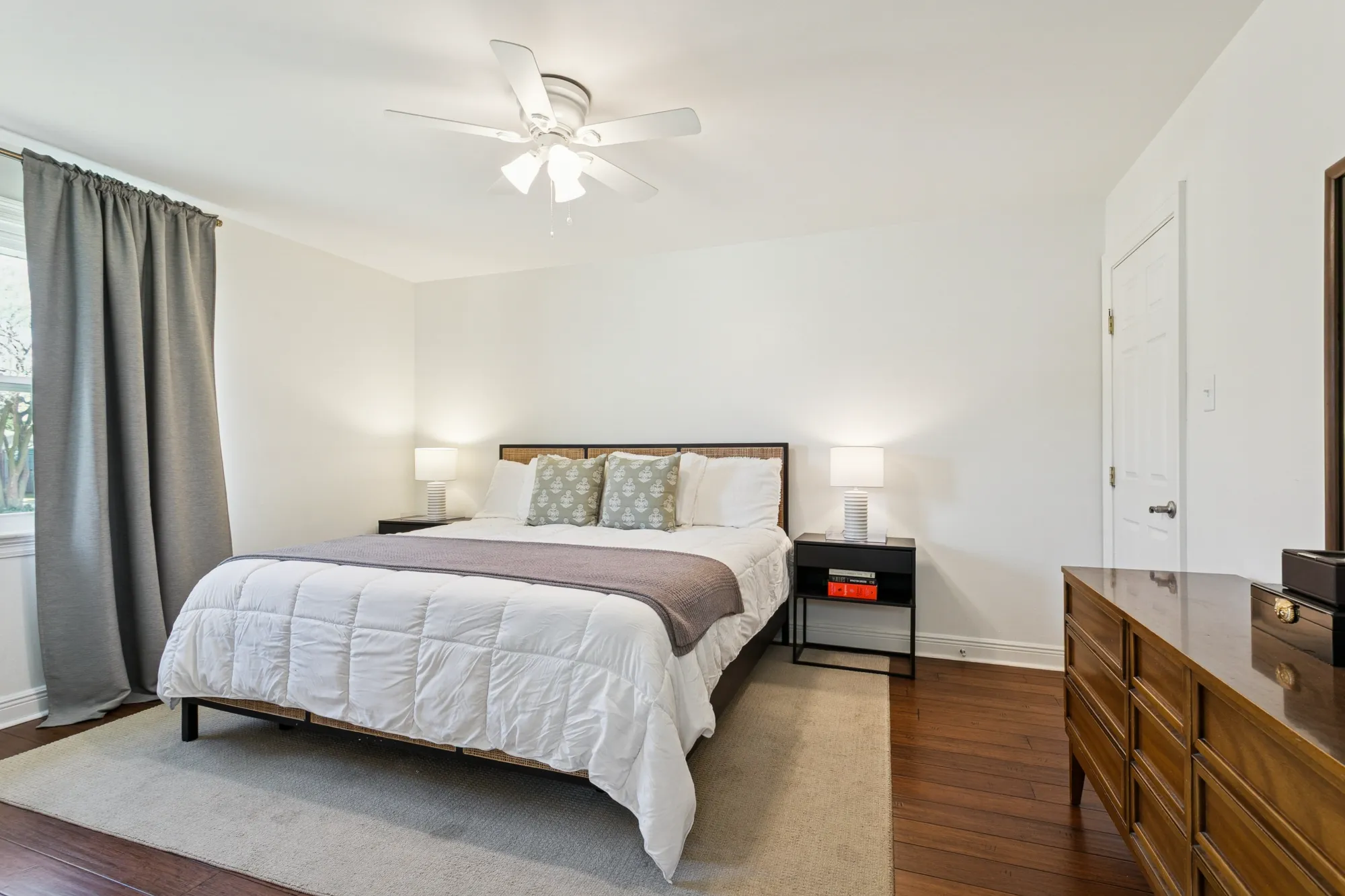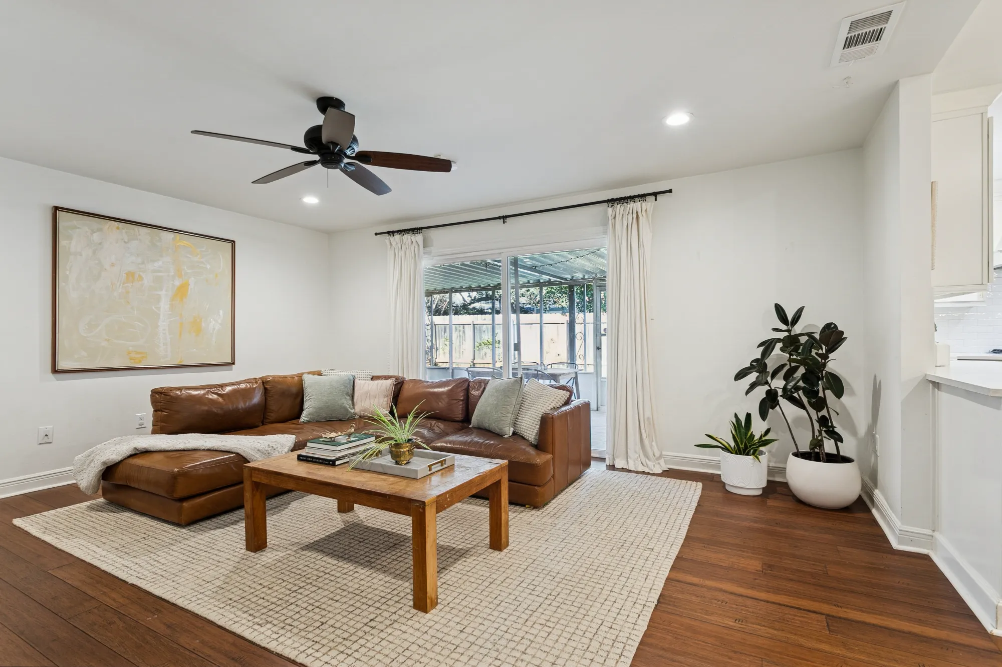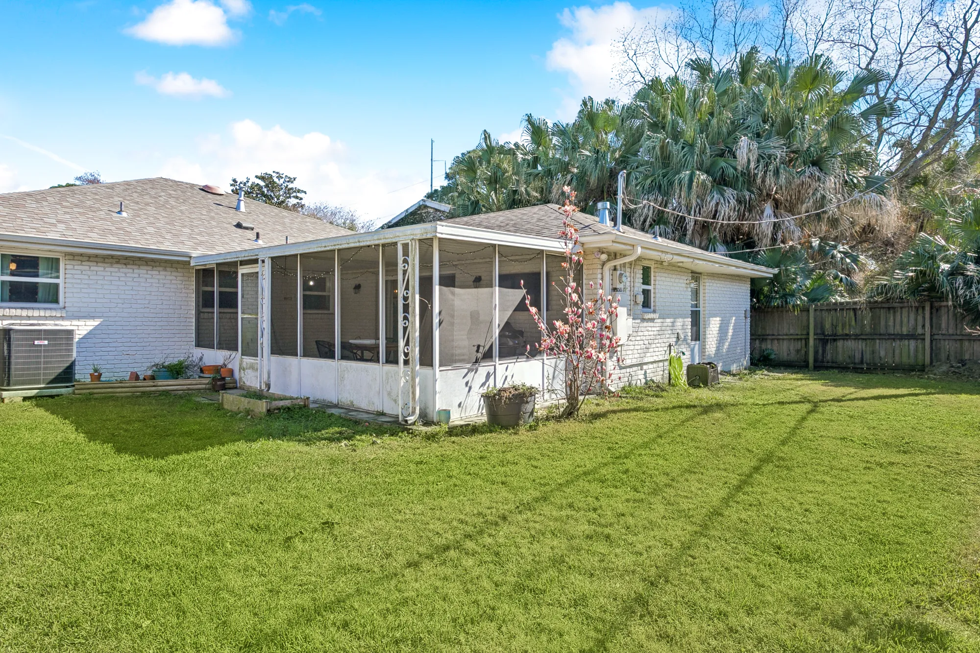 One wing of the home includes three bedrooms, two full baths, and a large storage room. Step out from the den to a screened-in porch overlooking the gated backyard.